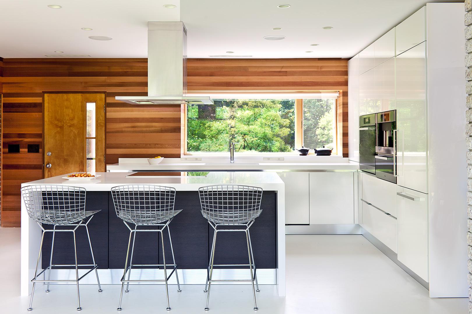 Who says feature walls are only for bedrooms and living areas? In a strikingly modern kitchen, where pristine white cabinets and sleek modern lines dominate, a cedar feature wall becomes a beacon of warmth and natural charm. This strategic addition surrounds the window facing the backyard, effortlessly marrying the lush outdoor greenery with the kitchen’s contemporary design. The cedar’s rich tonal range injects a much-needed warmth into the space, softening the modern aesthetic without undermining its streamlined elegance. Designed by Jeff Jordan Architects, this contemporary culinary hub is a perfect example of how natural materials can enhance modern interiors, creating a space that feels both refined and inviting.
