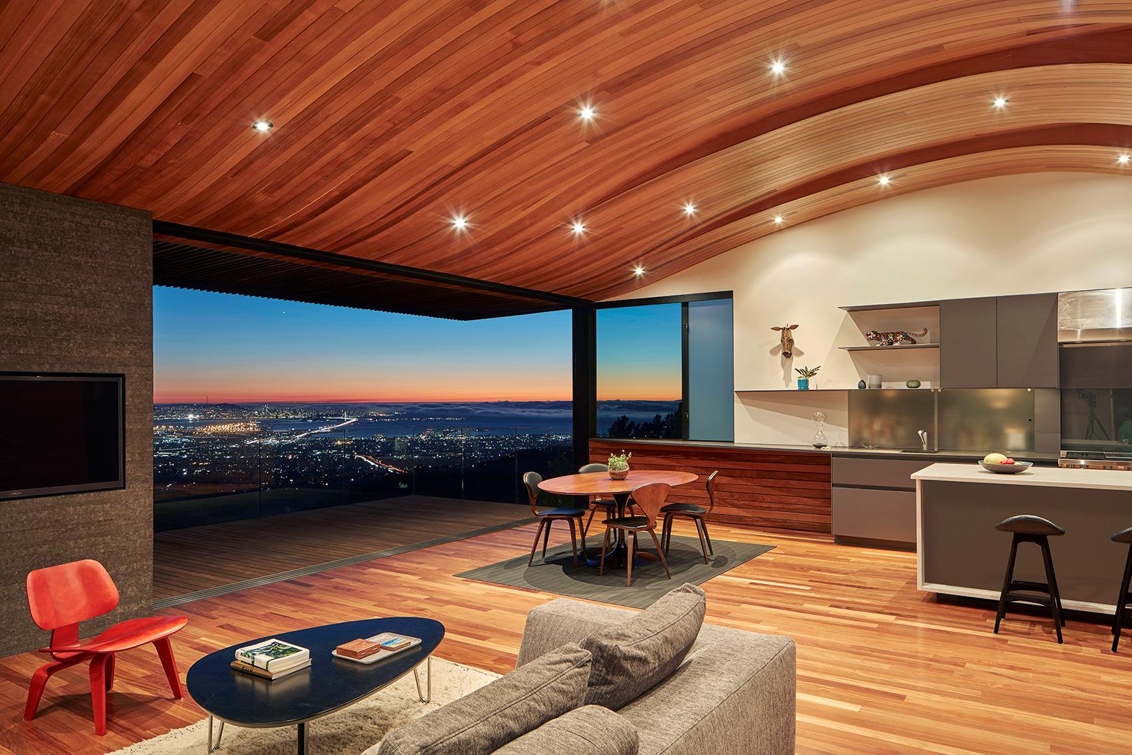1.Chew with a View – Nestled in the San Fransisco Bay area, this open living space in has some serious curve appeal. The wavy cedar ceiling is an absolute architectural showstopper (the view’s not half bad either). With so much built-in natural beauty, the dining area is already a visual feast so there’s no need for an elaborate banquet table. Wisely, the homeowners kept their furnishings simple. After all, no need to distract from all that gorgeous use of Real Cedar.