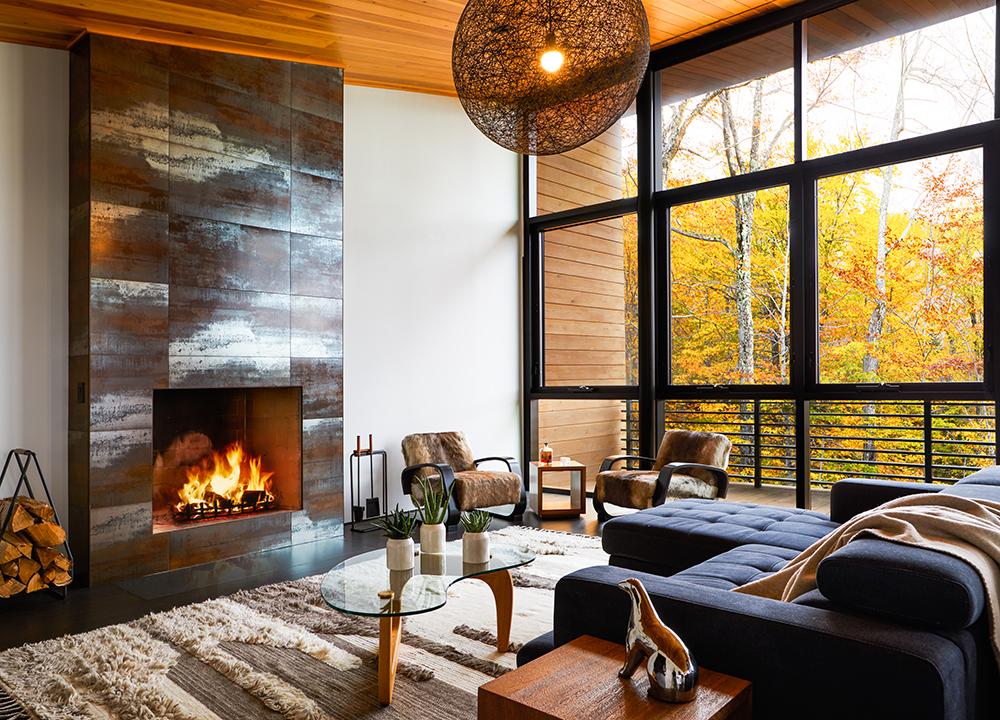 The herringbone pattern of the naturally stained cedar slats gives depth to the architecture, providing a dynamic backdrop for the double-sided glass fireplace design. The dark cedar exterior of this upstate New York summer home, meanwhile, reflects a tangible element of nature, providing a connection to the land.