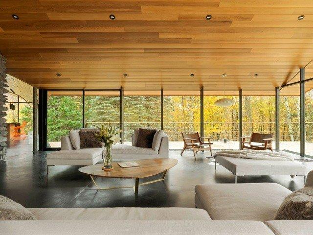 The Cedar ceiling on RobitailleCurtis’s Laurentian ski lodge blends brilliantly with the lush surrounding forest of spruce, maple, beech and birch trees. Perched on the steep slope of a former ski hill in a Quebec winter wonderland, this modern Laurentian family retreat brilliantly showcases the warmth and functionality of Western Red Cedar.