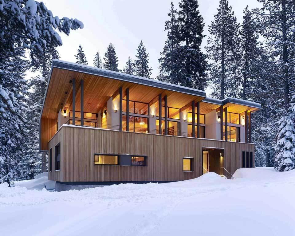 A butterfly roof may seem an unlikely choice for an area that boasts some of the highest snowfalls in California. That said, what you can’t see is that the striking canopy sits on radiating glulam beams designed to take massive snow loads. Of course, the other show-stopping aspect of this powder palace has to be the knotty Real Cedar siding.