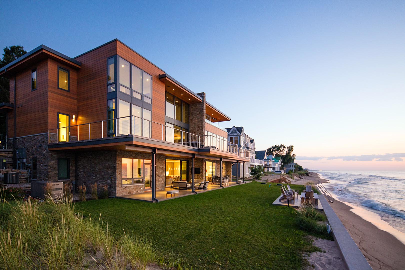 On this particular strip of Lake Michigan shoreline, houses are built immediately off the road and navigate the steep slope to the beach. Consequently, this Indiana vacation home appears low and linear from the street, somewhat modest. Once inside, however, the full splendour of this design is revealed with a large window system that opens out to the deck offering spectacular views of the lake as well as a peek of Chicago’s skyline across the water. The space that houses this glass wall is a stunning, two-story high space with a fireplace that wraps up and across the ceiling. The lower level, that is beachside, accommodates a relaxed beach and entertaining lifestyle. It’s from these latter vantage points, the use of beautiful Western Red Cedar siding is fully appreciated.