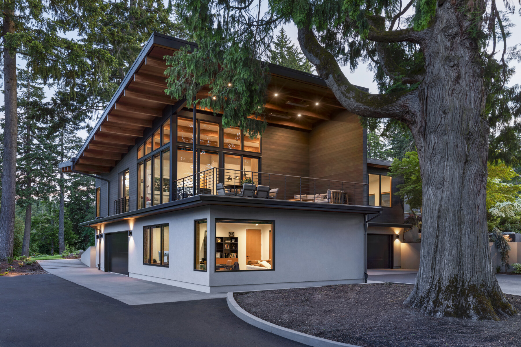 “It seemed like a natural choice for the site,” says Schouten. “We wanted a Northwest material that felt warm but still modern. It complements the beams, the concrete base, and the dark metal windows and trim.”