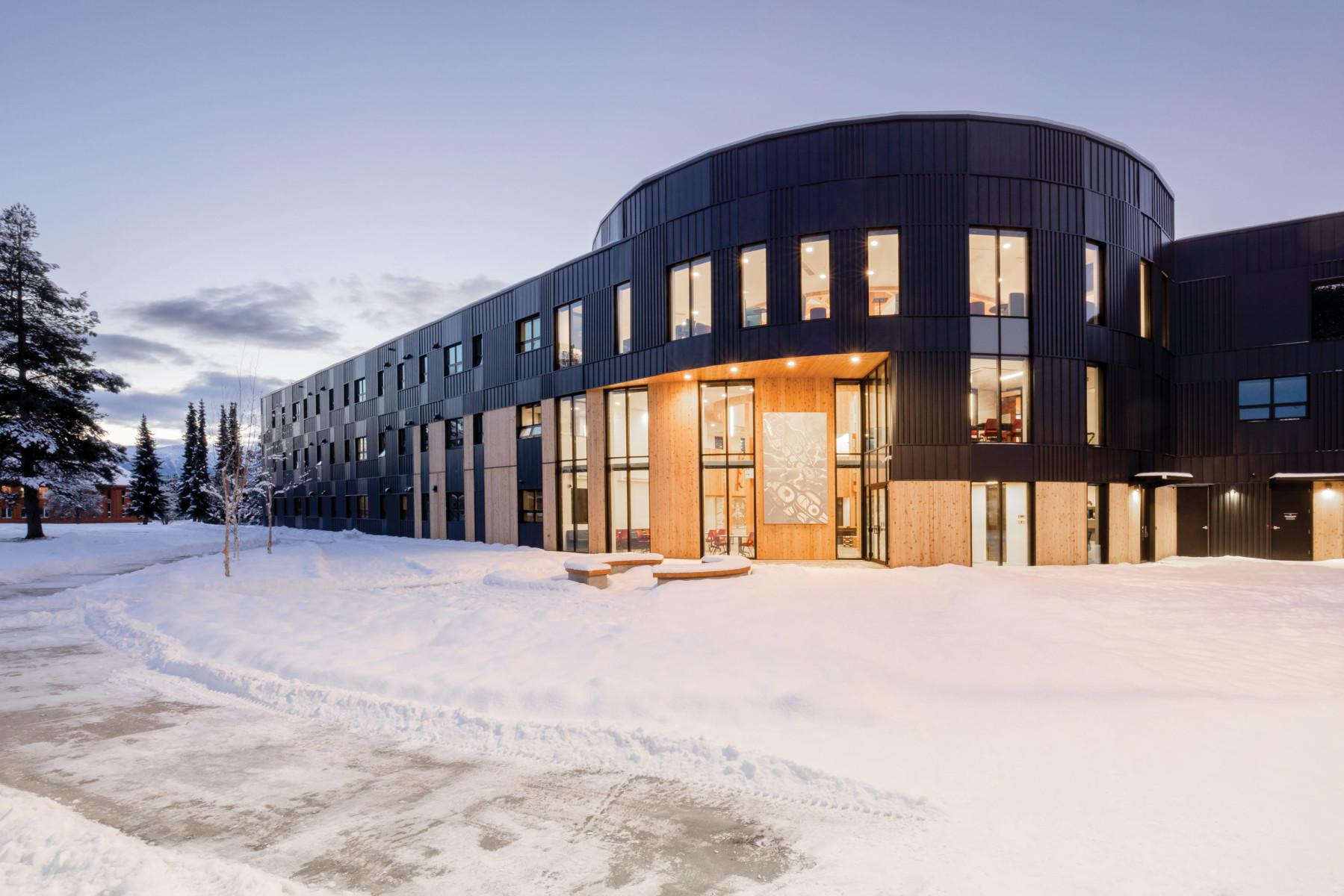 Sitting on the traditional territory of the Tsimshian Kitsumkalum people, Wii Gyemsiga Siwilaawksat is a new student housing building located on the Coast Mountain College (CMTN) campus in the mountainous northwest region of Terrace, BC.
