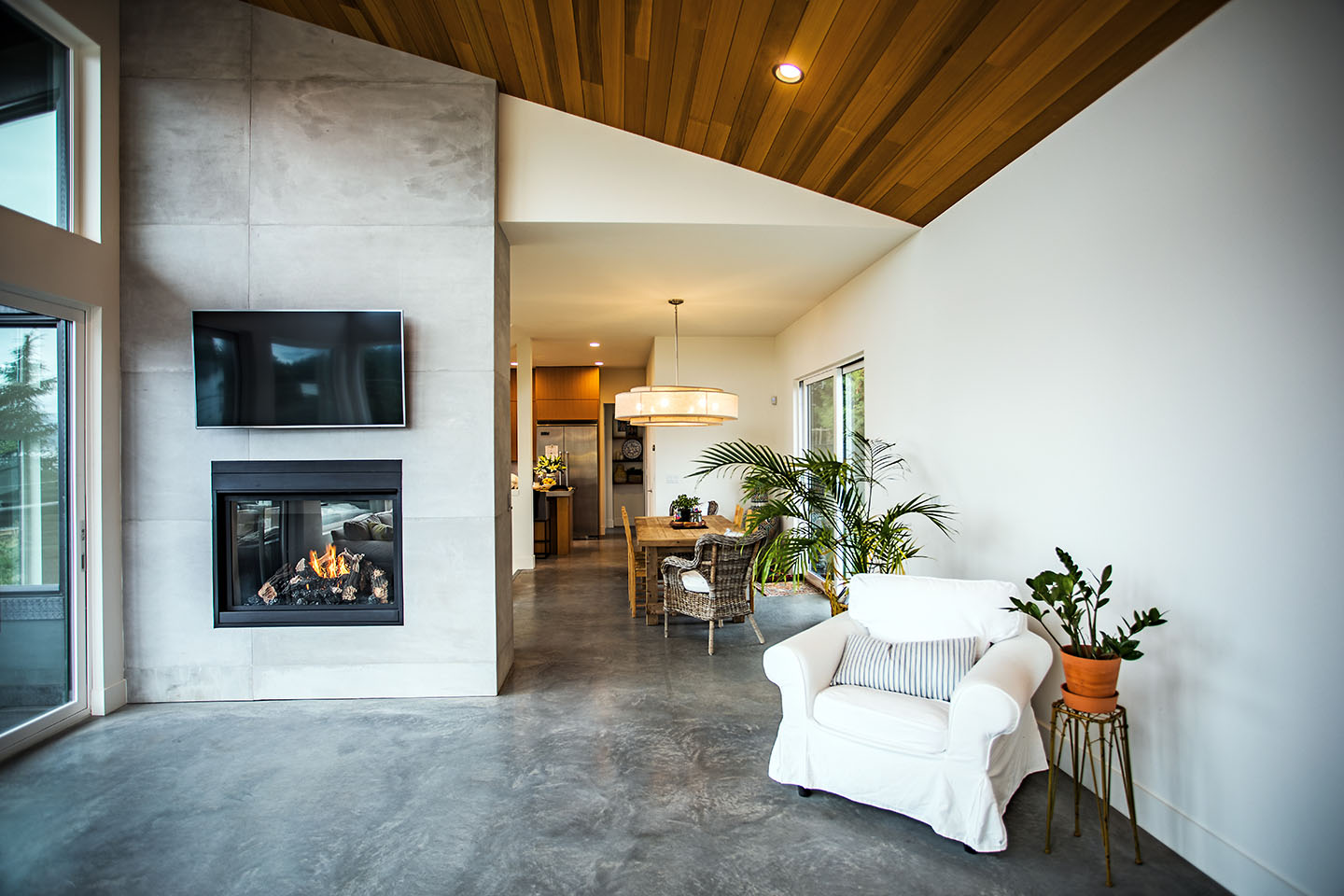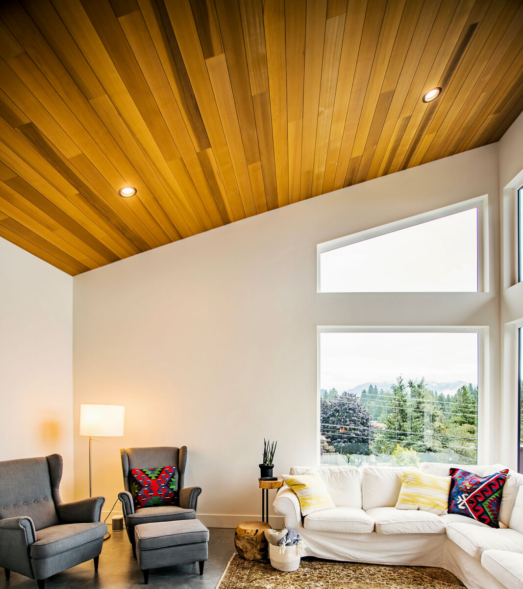 When a uniform, fine-grained look is the goal, Veneer Overlaid T&G Cedar is an excellent option. This application creates striking interior or exterior spaces, capturing the natural beauty of cedar. Moreover, with only ⅛” thick clear veneer bonded to a back piece, it guarantees a more sustainable use of resources.