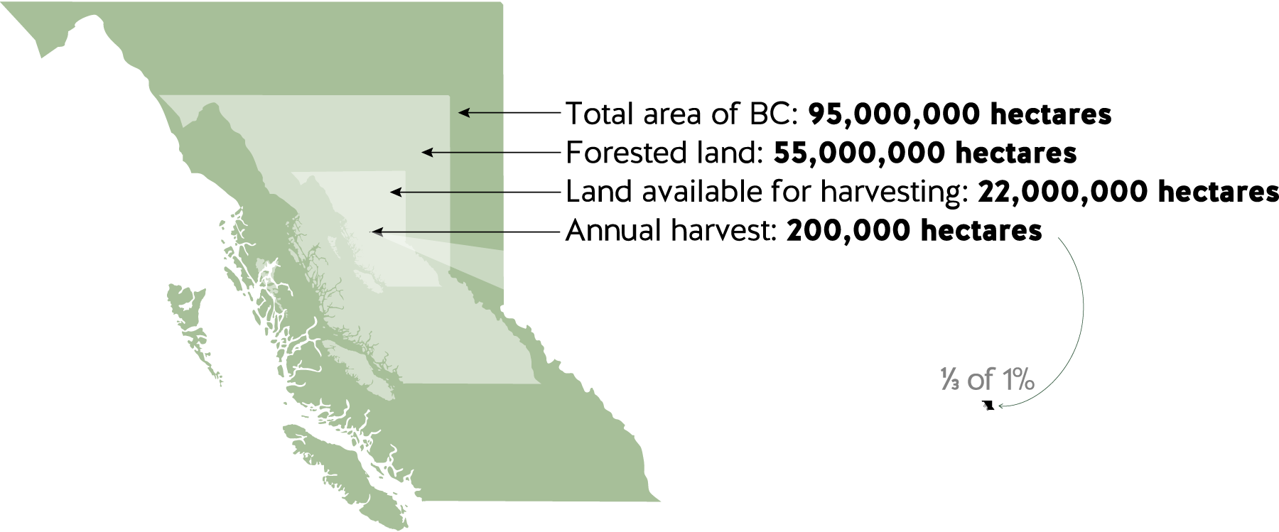 Less than 0.5% of all BC’s forests are harvested annually. By law these lands are immediately reforested.